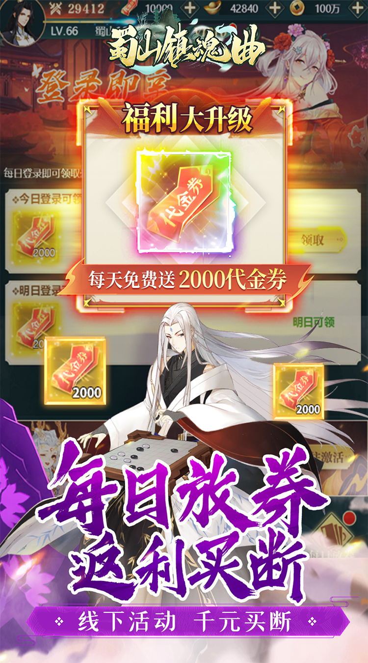 1、拒绝数值膨胀,首续充值永久享受0.1折优惠,每日放券领取2000代金券 2、买断版:累计充值千元,线下领取千万代金券 3、快人一步,仅需0.98元直升200级; 4、创角即送元宝*8888,金币*100万,飞剑太白*1、时装甘遂*1; 5、连续登录天天送绝版道具,次日超萌灵宠时装、三日红色法阵外观、七日极品红色飞剑; 6、每日签到即可领取稀有珍惜材料,百万铜币,上千真充卡 7、挂机送元宝,打boss掉真充卡,超高爆率,装备全靠打,不花钱也没轻松神装毕业;
