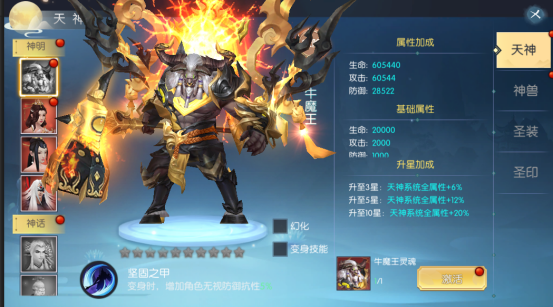 u 天神功能开启后,在战斗中可变身成天神战斗;变身后,所有主动技能的伤害增加10%;可以自由选择变身的天神,每位天神变身后都有一种独特的被动技能