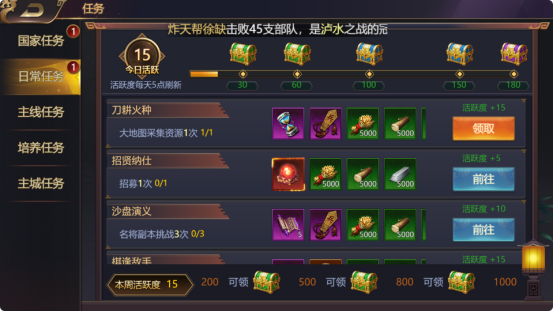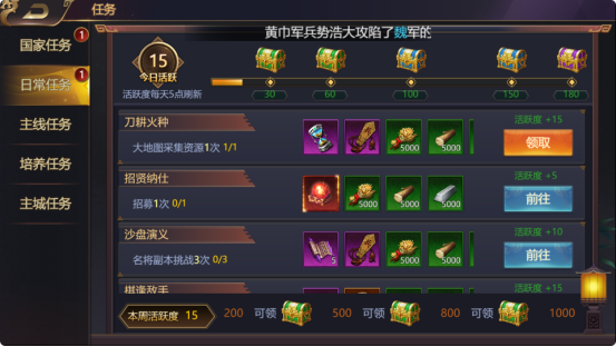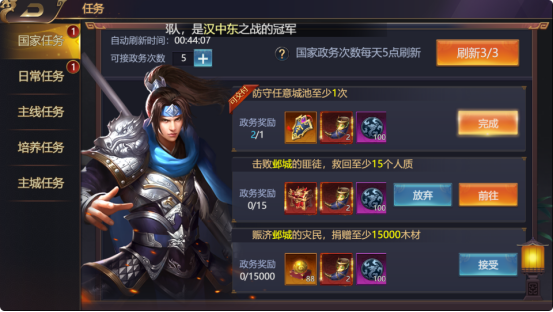 任务模块分为五类,分别是主线任务、国家任务、日常任务、培养任务、主城任务。完成任务可获得奖励,不同的任务奖励也不同,同时主城爵位升级、武将升星、升级等其他需要升级的模块,都需要去完成对应的任务才能升级升星等升级操作。