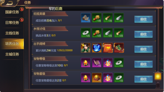 解锁更多的武将和提高武将的等级可以完成培养任务获得培养任务的奖励。