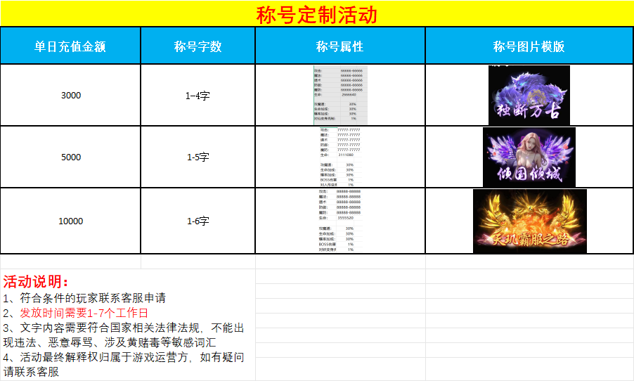 | 活动时间:永久 活动范围:全服玩家 活动内容:单个区服内,第一个实付充值到2000元的玩家,可对本区服进行限时冠名;实付充值到10000元的玩家,可以顶替限时冠名的玩家,并且享受永久冠名权利 限时冠名礼包:灵符X200万,定制称号-冠名大哥X1,神戒6阶自选宝箱X1 永久冠名礼包:灵符X1000万,定制顶级称号-冠名神豪X1,神戒8阶自选宝箱X1,坐骑:金玉麒麟X1 活动说明: 1.符合冠名条件的玩家联系客服申请,先到先得 2.所有达到冠名金额的玩家均可领取一份冠名礼包 3.冠名字数仅限2-4个汉字,冠名内容需要符合国家相关法律法规,不能出现违法、恶意辱骂、涉及黄赌毒等敏感词汇 4.活动最终解释权归属于游戏运营方,如有疑问请联系客服 | ||||||||